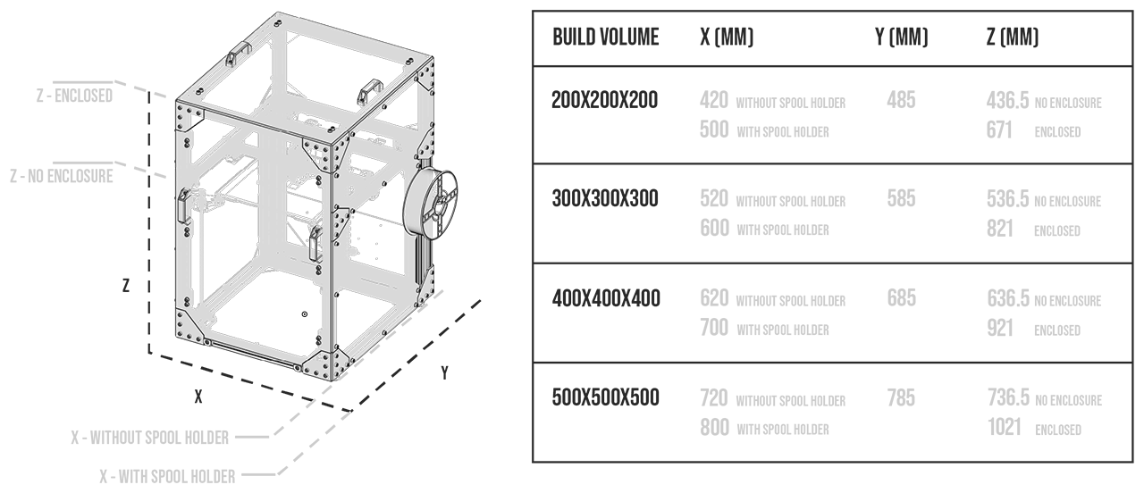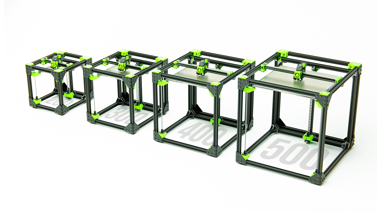 4 build volumes available as standard option: 200, 300, 400 and 500 mm3