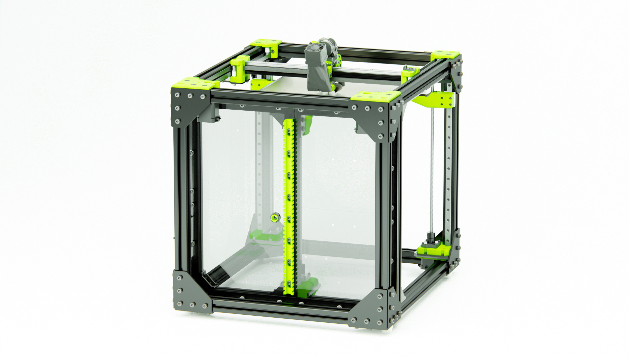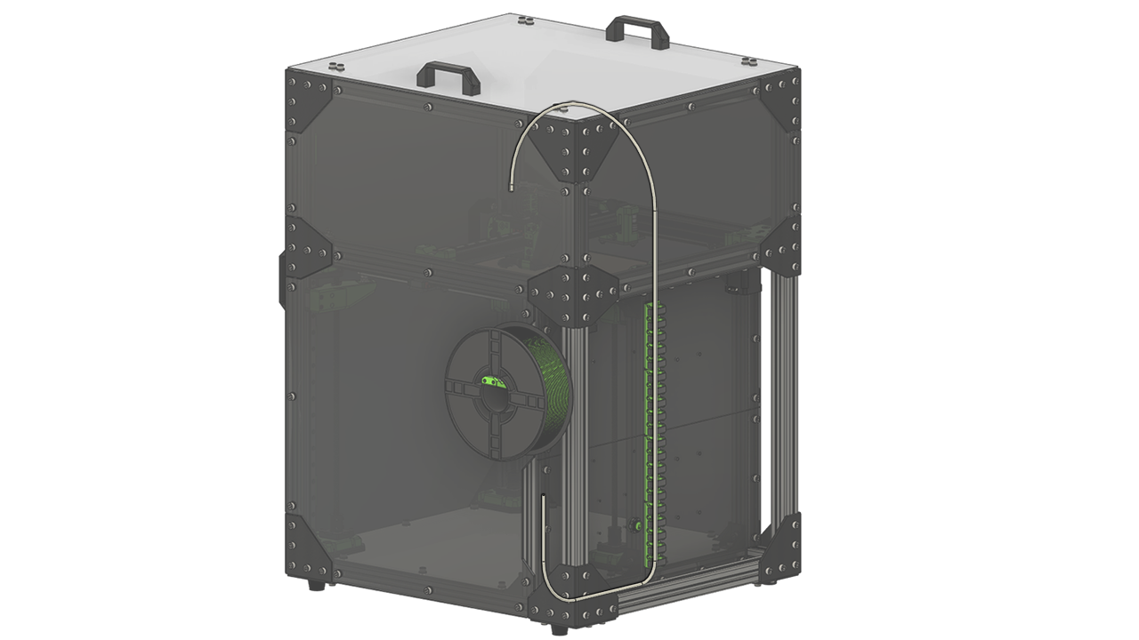 The V-Core 3 was designed from the ground up with full enclosing in mind, with no need for an external enclosure. The design ensures that all motors and electronics are safely placed outside the printing chamber, so they are shielded from high temperatures, and no machine elements protrude from the frame, ensuring that the frame can be directly covered with panels from all sides.
