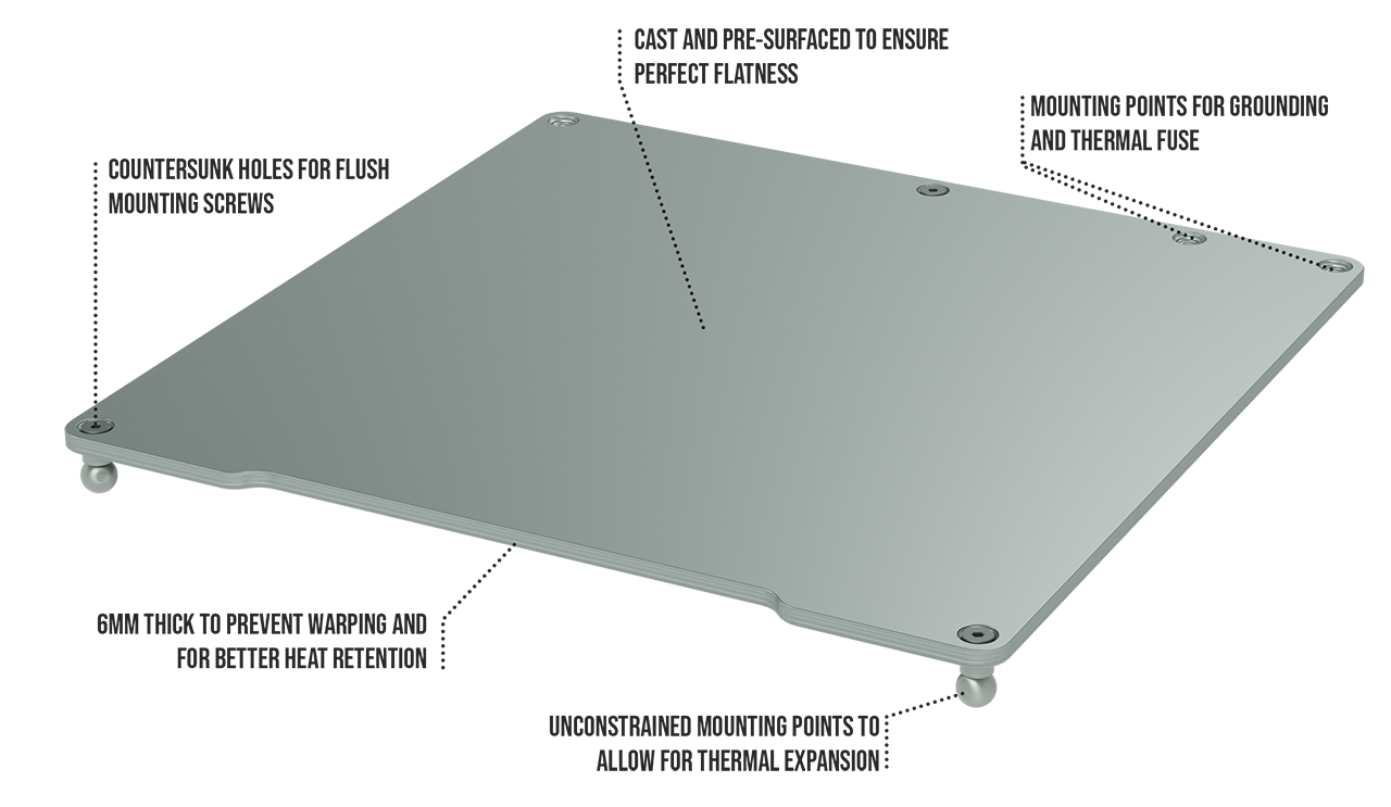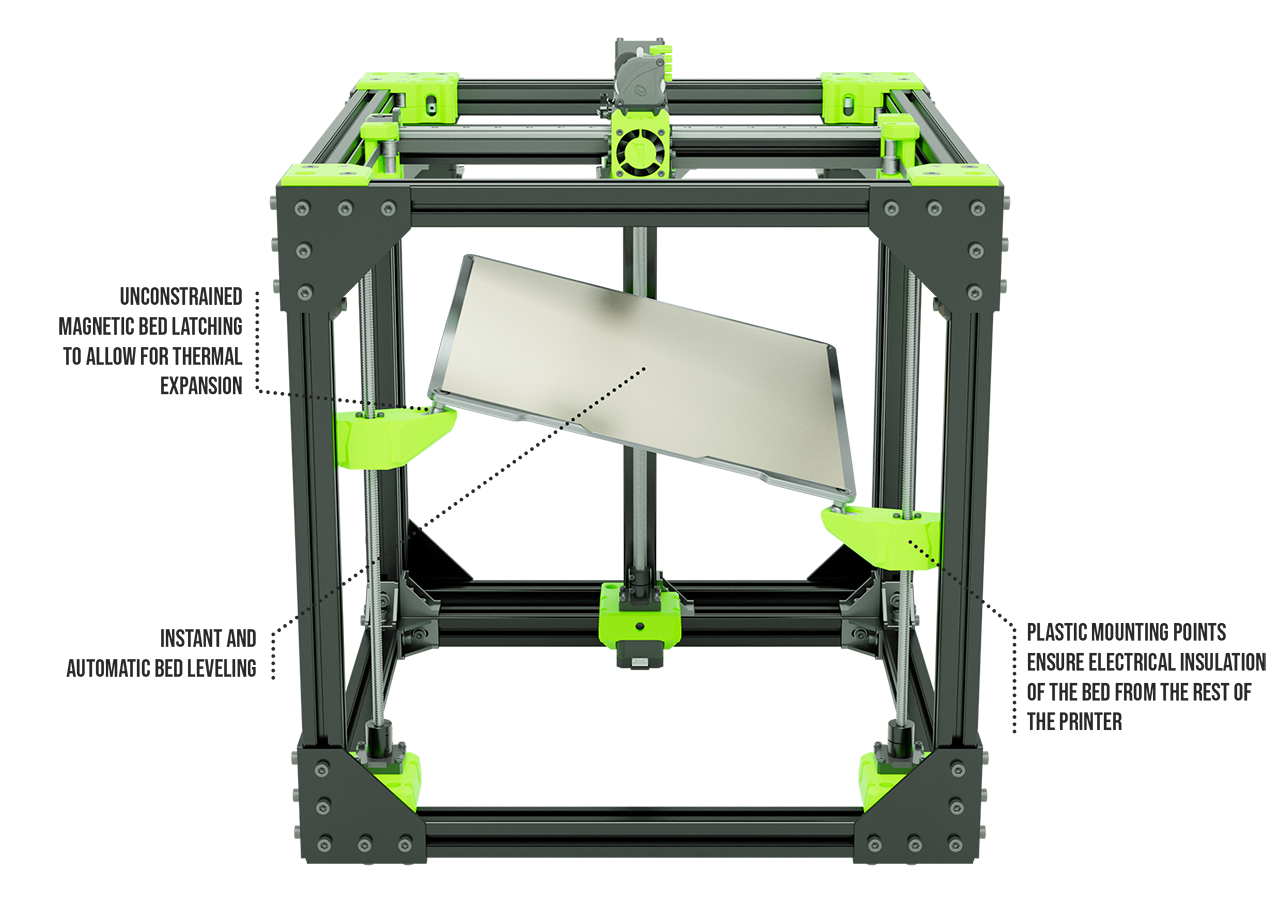For 120/220V Heat pad users, grounding point at the bed and fully isolated bed from the rest of the printer means that the printer frame is never conducting any dangerous voltages.