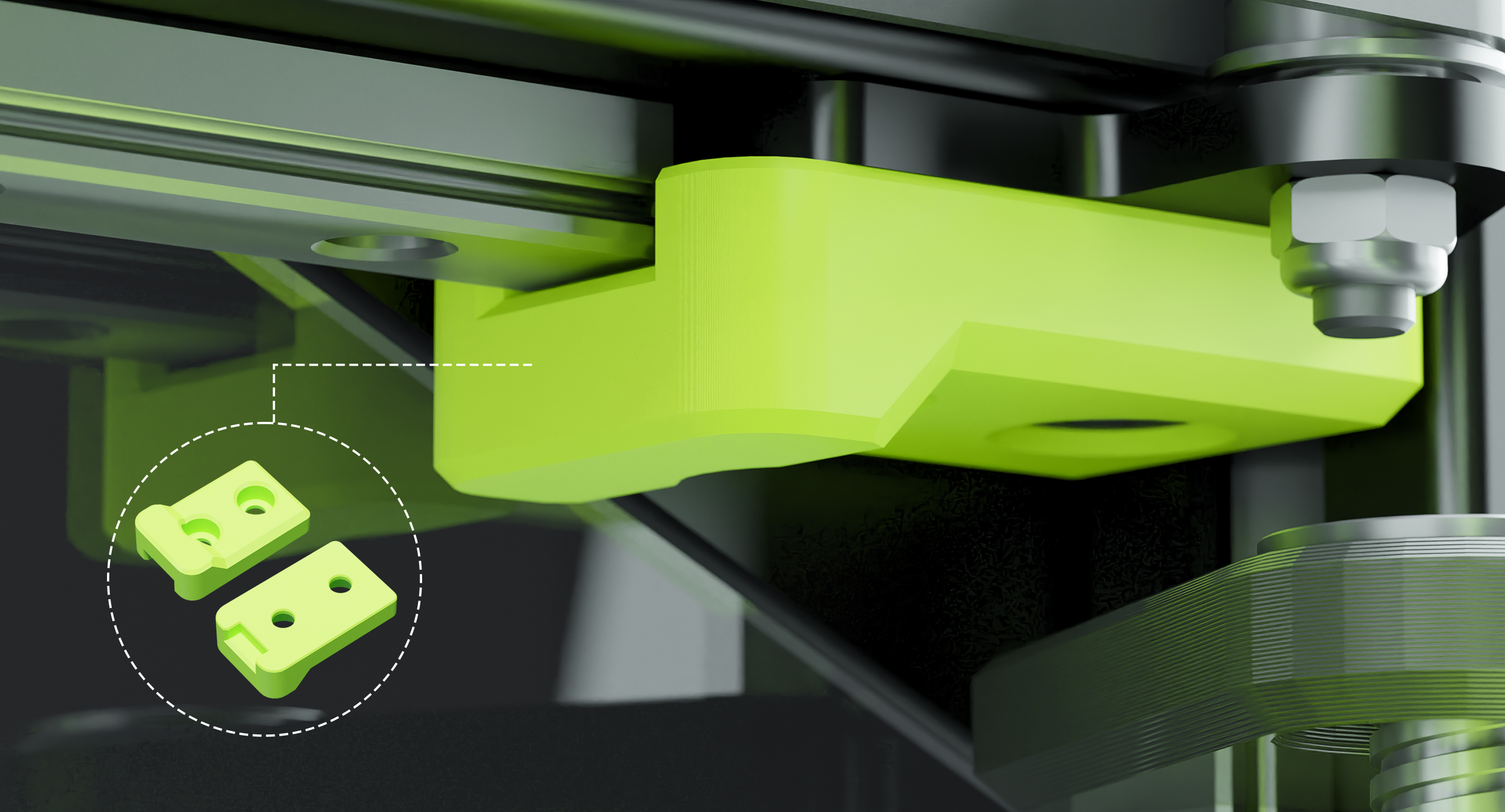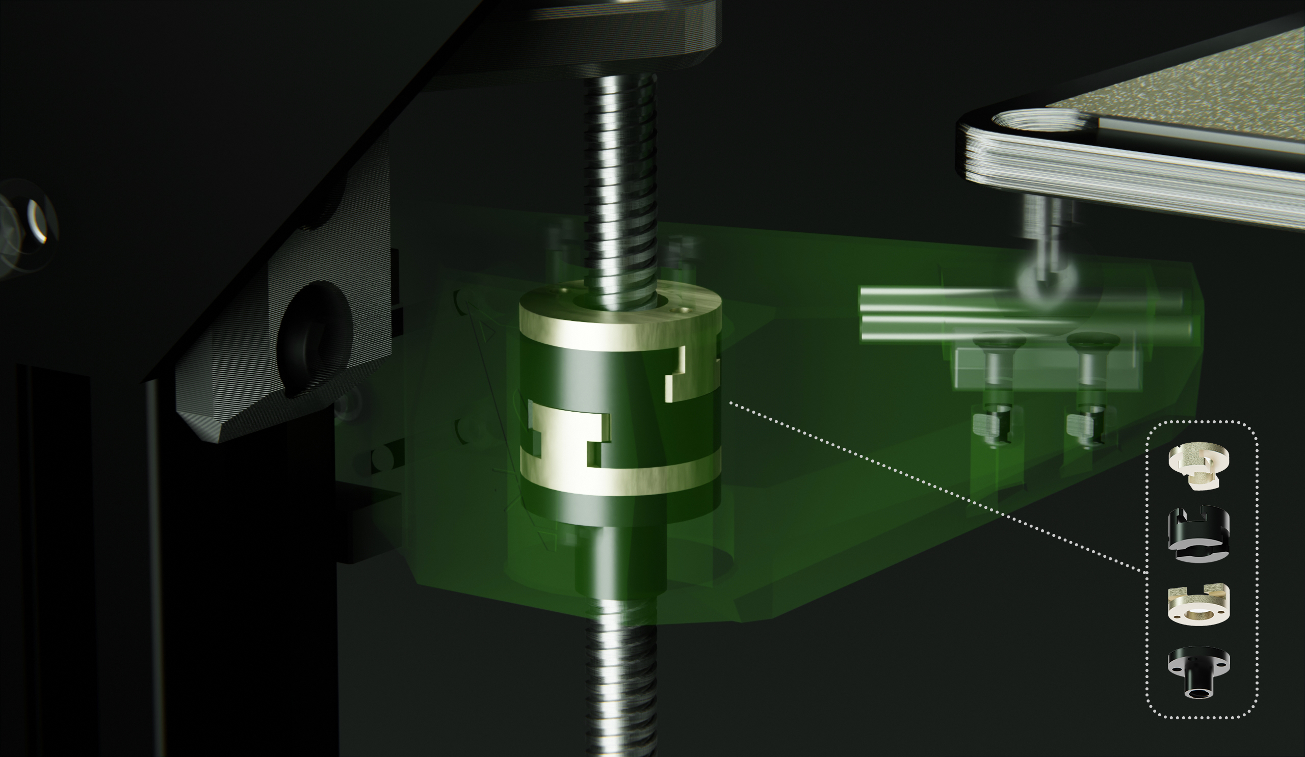 Bi-material Decouplers on Z arms ensure that any inconsistencies on the drivetrain won't be transmitted to the print surface