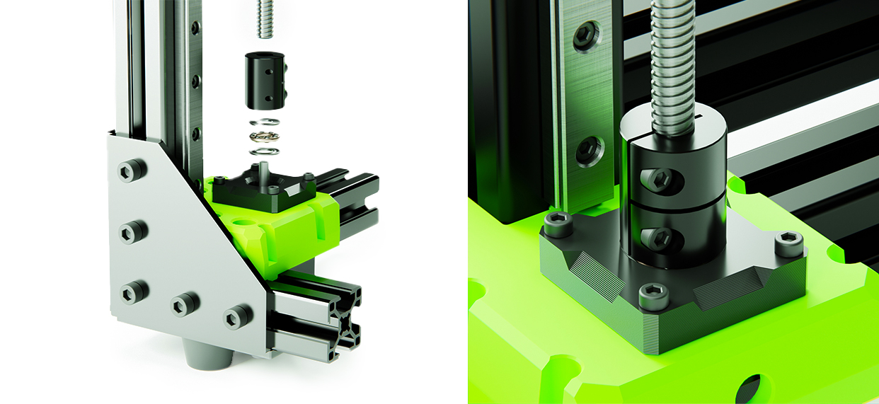 The V-Core 3 uses 3 lead screws to drive the Z axis of the machine. They move the bed down in small increments, at the end of each complete layer. The Z axis moves very slowly, so speed is not the priority - precision and resolution are. The V-Core 3 uses TR8X4mm lead screws instead of the TR8x8mm used in previous machines, effectively halving the pitch of the lead screw - this means that each rotation of the motor, now moves the bed half as much. This both doubles the Z resolution of your layers and multiplies the holding torque - always helpful when you're moving such a heavy bed, especially on the larger variants.
